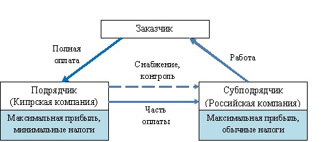 Данная схема заключается в трехстороннем сотрудничестве заказчика, подрядчика и субподрядчика. Офшорная компания выступает в роли подрядчика, а российские фирмы в роли заказчика и субподрядчика. Заказчик, договариваясь с подрядчиком – офшорной компанией о строительных работах, полностью их оплачивает. Офшорная компания в свою очередь заключает договор с субподрядчиком, который и будет на территории Росси выполнять все работы. В итоге основная прибыль остается за рубежом на счете офшорной компании [4] (рисунок 5).