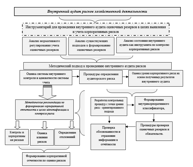 Формирование оценочных резервов, с одной стороны, направлено на учет бизнес-рисков, а с другой, служит дополнительным источником корпоративных рисков, средством манипуляции с отчетностью, обладая высокой вариативностью, зависимостью от учетной политики компании и профессионального суждения бухгалтера [7]. Поэтому внутренний аудит рисков оценочных резервов представляет собой процесс контроля со стороны собственников за их формированием и влиянием на показатели финансовой отчётности, имеющий целью оценку эффективности управления корпоративными рисками, обусловленными использованием оценочных резервов и оценочных обязательств.
