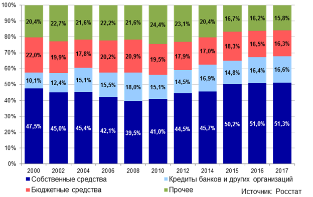 Рис. 1. Структура источников инвестиций российских предприятий (2000 – 2017 г.г.)
