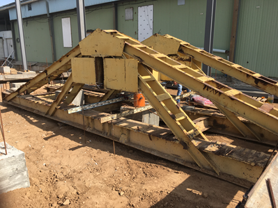 Статические испытания свай производились в соответствии с требованиями ГОСТ 5686-2012. Передача нагрузки осуществлялась при помощи гидравлической системы, включающей в себя насосную станцию марки НРГ-7160 и гидравлический домкрат марки ДГ200П150 грузоподъемностью до 200,0 тс (рис. 2). Контроль за величиной давления в системе выполнялся при помощи манометра с ценой деления 10,0 бар. В качестве опорной конструкции, воспринимающей вертикальную нагрузку отпора, применен испытательный стенд в виде стальной фермы, закрепленной к анкерным сваям. Для наблюдения за ходом развития осадок опытных свай использовалась реперная система с прогибомерами с ценой деления 0,1 мм. Принимая во внимание инженерно-геологические особенности площадки строительства, а также требования п.6.8 ГОСТ 5686-2012, выполнялось замачивание основания свай. Данная процедура проводилась перед началом статического испытания и продолжалась вплоть до окончания последних. Замачивание грунта выполнялось через специальные траншеи, заполненные щебнем, устраиваемые по периметру испытываемой сваи на расстоянии 1,0 м от боковой поверхности.