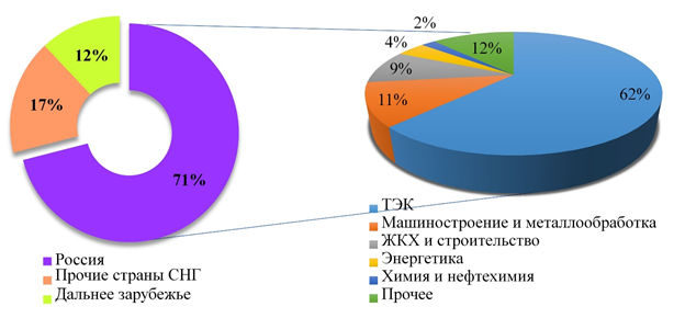 Рисунок 3 – География продаж и структура отгрузки трубной продукции по отраслям за первые три квартала 2020 года [8]
