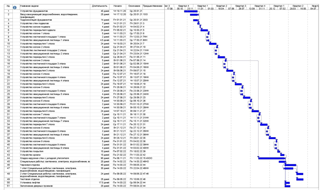 Так, при проектировании здания девятиэтажного общежития ФГБОУ ВО «Южно-Российском государственном политехническом университете (НПИ) имени М.И. Платова» в г. Новочеркасске Ростовской области возникла необходимость в увязке нескольких десятков работ, проводимых одновременно на разных захватках.