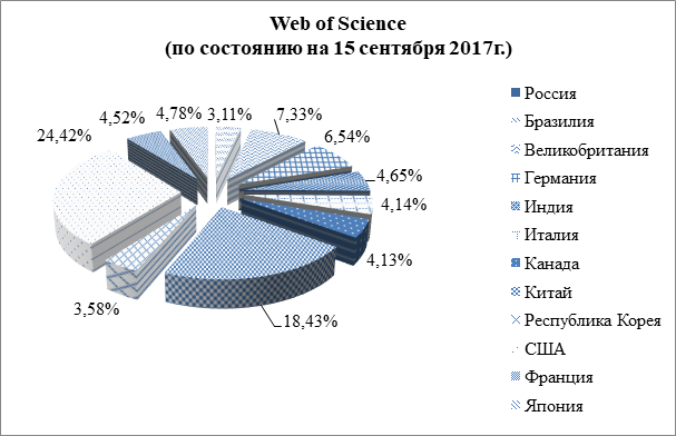 Как видно по данным, представленным на рис. 3, рис. 4, Россия имеет наименьший удельный вес в общемировом числе статей в научных журналах, индексируемых в международных базах данных. Доля отечественной науки в области публикационной активности составляет Web of Science - 2,56% и Scopus - 2,86%, для сравнения анализируемый показатель США составляет 24,42% и 21,44% соответственно, Китая 18,43% и 20,31% соответственно.
