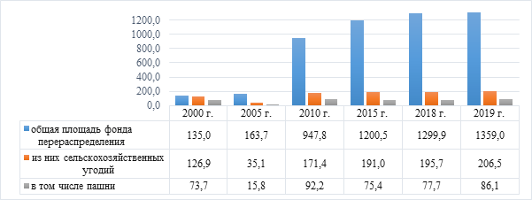 Согласно данным статистических наблюдений на 01.01.2020 г. общая площадь земель фонда перераспределения составила 1359,0 тыс. га, из них сельскохозяйственные угодья занимают 206,3 тыс. га, в том числе пашня – 86,1 тыс. га, залежь – 17,5 тыс. га, многолетние насаждения – 0,1 тыс. га, кормовые угодья – 102,6 тыс. га. Отмечается, что за период 2000-2019 гг. площадь земель фонда перераспределения увеличилась на 1224,0 тыс. га (рисунок 4).