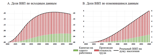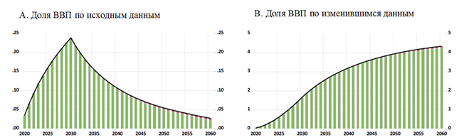 По изначальному сценарию развития пик объема государственных инвестиций приходился на 2030 год, а при внесении ряда реформ в изначальный сценарий развития наблюдается постепенное наращивание доли ВВП в зависимости от вложений.