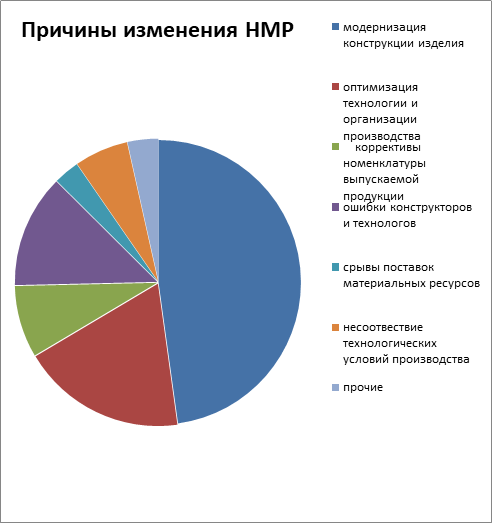 Причинами внесения изменений в норму могут быть результаты выполнения мероприятий, предусмотренных стратегиями инновационного развития предприятия и экономии ресурсов, такие, как : модернизация конструкции изделия; технологии и организации его производства; коррективы номенклатуры выпускаемой продукции. Внесение изменений, может быть также обусловлено рядом ситуационно-субъективных факторов, таких как : ошибки конструкторов и технологов; срывы поставок материальных ресурсов; несоответствие технологических условий подготовки производства и т.п. (рис.1).