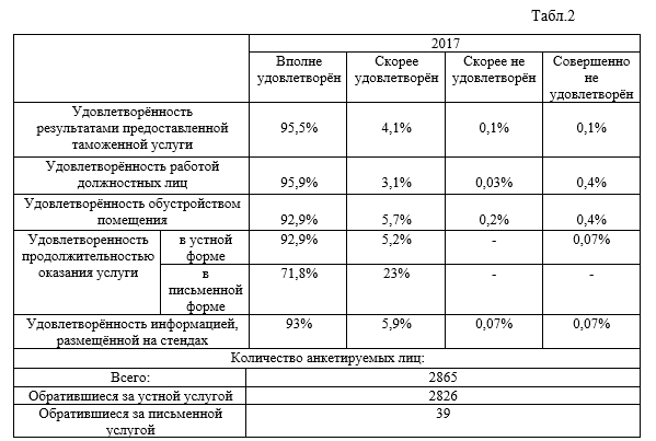 В 2017 году неудовлетворённых качеством услуги по информированию и консультированию среди опрошенных лиц стало больше (табл.2). В каждой графе, за исключением показателя удовлетворённости продолжительности оказания консультирования в письменной форме, есть, хоть и малый процент, недовольных определённым аспектом заявителей. Больше всего получателей не удовлетворила работа должностных лиц и обустройство помещения. Как было выяснено, обстановка помещения была слабой стороной и в предыдущем году. Однако работа должностных лиц была отмечена крайне положительно. Кроме того, в этом году появились лица, которые были совершенно недовольны результатом предоставленной таможенной услуги, из чего целесообразно заключить, что в 2017 году мероприятия по улучшению качества услуг были проведены в недостаточной мере.