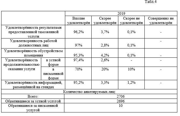 В 2018 году получатели услуги по информированию и консультированию в очередной раз были не удовлетворены обустройством помещения. Более того, наметилась негативная тенденция ответов «вполне удовлетворён», несмотря на то что полностью неудовлетворённых потребителей работой должностных лиц, результатом, продолжительностью предоставления услуги, информационными стендами в этом году не наблюдается (табл.3). Возможной причиной данного ухудшения может быть, реформирование таможенных органов. В этот период времени внимание было направлено на создание электронных таможен, поэтому необходимость развития таможенных услуг, в том числе и услуг по информированию и консультированию отступила на второй план.