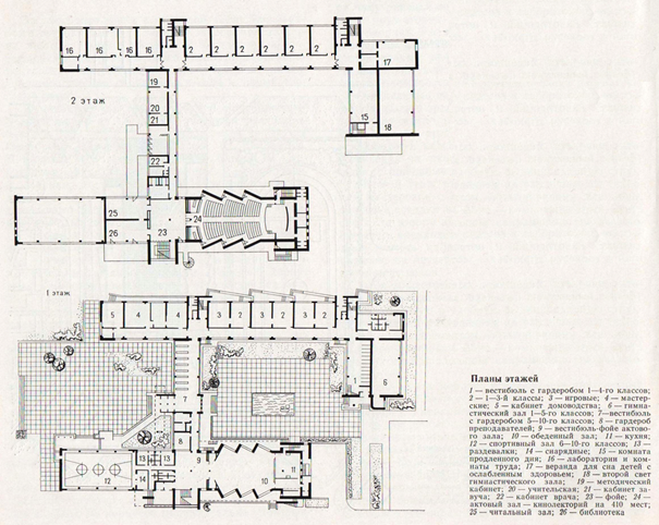 В эти годы было разработано свыше 50 типовых проектов школьных зданий на основе индустриального домостроения, в которых коридоры были заменены залами-рекреациями, а в следующем поколении новых школьных зданий дополнительно предусматривались производственные помещения, актовые и спортивные залы [5]. Например, в мастерской № 4 ЛенЗНИИЭП был разработан проект каркасно-панельного здания школы из трех блоков: в основном корпусе размещались учебные классы, во втором крыле — спортзал и столовая с актовым залом, в двухэтажном блоке, соединяющем основные, располагались гардероб и администрация (рис. 3).