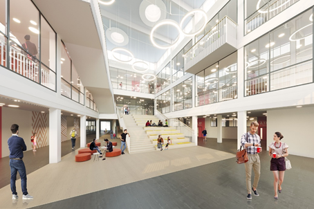 Архитекторы стараются уйти от типовых планировочных решений школ c применением школьного коридора, в котором практически нет света, обеспечить свободный доступ ко всем учебным помещениям и позволить ученикам осваивать их в свободное время [7]. Коридоры заменяются атриумами (рис. 4), что соответствует европейским тенденциям планировки школьных интерьеров. Территория атриума может быть выполнена в виде амфитеатра, который является местом коммуникаций.