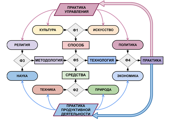 На рис. 3 введены следующие обозначения. Ф1 обозначает определяющие организационные факторы, которые порождает культура и искусство как легитимные способы деятельности в обществе. Ф2 – обусловливающие организационные факторы, которые порождает техника и природа как доступные средства деятельности в обществе. Ф3 – устанавливающие организационные факторы, которые порождает религия и наука как осуществимую методологию деятельности на основе легитимных способов и доступных средств. Ф4 – исполняющие организационные факторы, которые порождает экономика и политика как практическую технологию осуществления деятельности на основе легитимных способов и доступных средств в соответствии с принятой методологией. Ф5 – синтезирующие организационные факторы, которые порождает сама организация людей для совместной деятельности как фактическую организацию и фактическое управление продуктивной деятельностью в обществе.