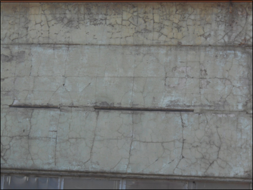 Истирание стеновых панелей. Нижний ряд стеновых панелей был подвержен механическому воздействию транспортной нагрузкой, вилочные погрузчики при размещении поддонов с грузом постоянно били деревянными поддонами и вилами стеновые панели, разрушая при этом защитный слой (рис. 3). Техническое состояние панелей оценивалось как ограниченно работоспособное. Для устранения повреждения было рекомендовано выполнить оштукатуривание стеновых панелей.