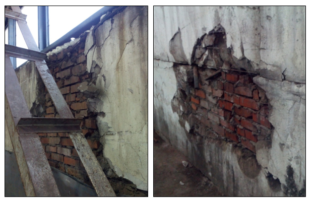 Разрушение защитного слоя бетона внутри помещений. С внутренней стороны здания так же происходили процессы регулярного механического повреждения, что привело к разрушению защитного слоя бетона, обнажению и коррозии арматурного каркаса панели (рис. 4). Техническое состояние стеновых панелей оценивалось в зависимости от степени поврежденности как ограниченно работоспособное или недопустимое. Для устранения выявленных повреждений было рекомендовано очистить арматуру от продуктов коррозии и выполнить оштукатуривание поврежденных стеновых панелей.