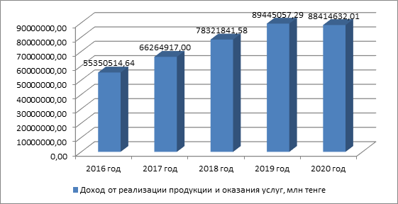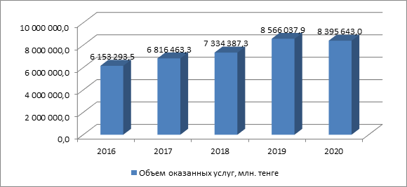 Доход от реализации продукции и оказания услуг за 2016-2020 годы имеет динамику роста, так в 2016 году услуги составляли 55350514,66 млн. тенге, а в 2020 году уже 88414632,01 млн. тенге, что больше почти на 60%. Однако, в 2020 году наблюдается небольшой спад по сравнению с 2019 годом, что связано с кризисом вызванный пандемией. Далее рассмотрим долю объема оказанных услуг в Казахстане отображён на рисунке 2.