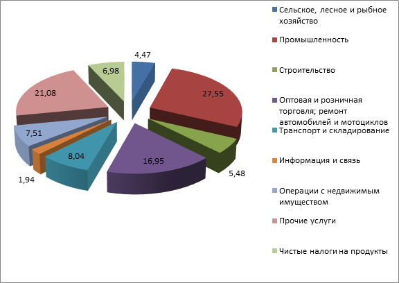 Лидером в структуре Валового продукта по видам экономической деятельности за 2020 год является промышленность - 27,55%, прочие услуги 21,08% и оптовая и розничная торговля; ремонт автомобилей и мотоциклов 16,95%. Наименьшая доля приходится на информацию и связь - 1,94%, сельское, лесное и рыбное хозяйство - 4,47%, строительство - 5,48%. Как видим, услуги занимают не малую долю от Валового продукта по видам экономической деятельности.
