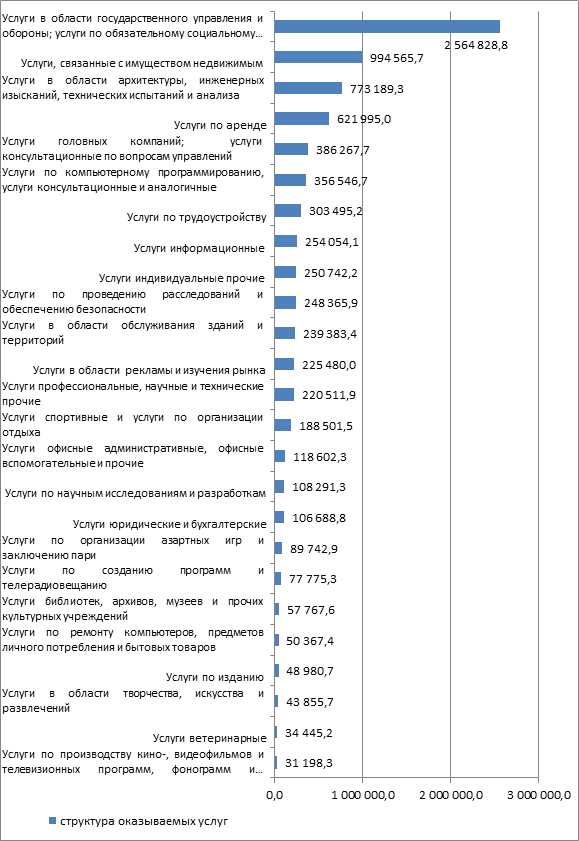 Удельный вес оказываемых услуг приходится на услуги в области государственного управления и обороны; услуги по обязательному социальному обеспечению 2564828,7806 млн. тенге, далее услуги, связанные с имуществом недвижимым 994565,6534 млн. тенге и в тройку лидеров оказанных услуг вошли услуги в области архитектуры, инженерных изысканий, технических испытаний и анализа 773189,3156 млн. тенге.