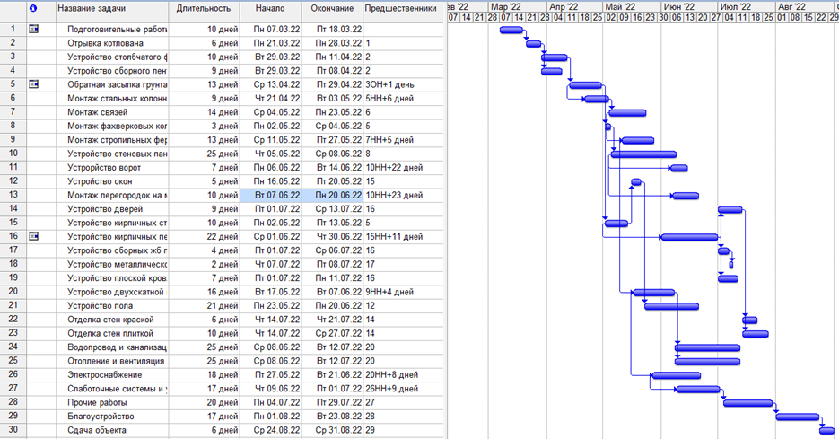 На основании результатов расчета продолжительности был построен график производства работ (рис. 14). Продолжительность работ составила 171 день.
