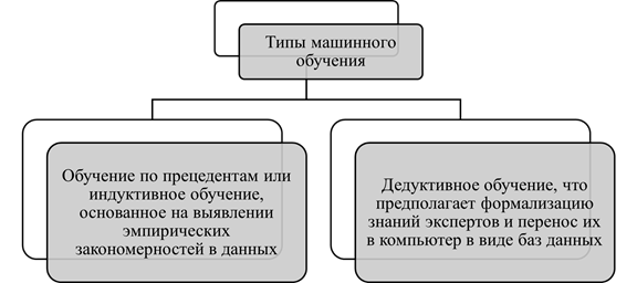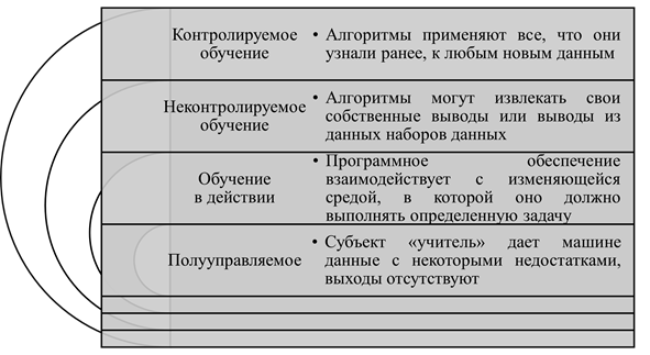 Машинное обучение — это особый класс методов искусственного интеллекта, характерной чертой которого является не прямое решение задач, а обучение в процессе применения решений множества сходных задач. Основная идея заключается в том, чтобы машина не просто использовала заранее известный алгоритм, а самостоятельно принимала решения для поставленной задачи. Раздел машинного обучения образовался в результате науки о нейросетях и математической статистики.[7] Типы обучения представлены на рисунке 1.
