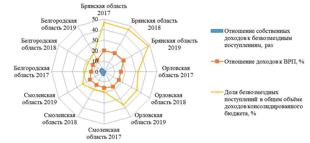 Как видим, наиболее благоприятное значение из представленной совокупности показателей, определяющих бюджетную эффективность, характерно для Белгородской и Смоленской областей. При этом, в Брянской области наблюдается наибольший размер безвозмездных поступлений в общем объеме доходов консолидированного бюджета.