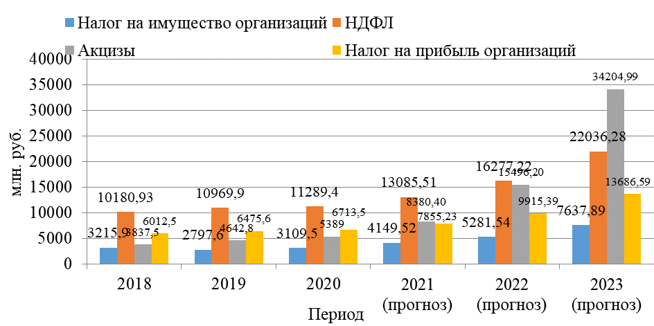 Рис. 3. Прогноз поступлений основных бюджетообразующих налогов Брянской области в 2021-2023гг.