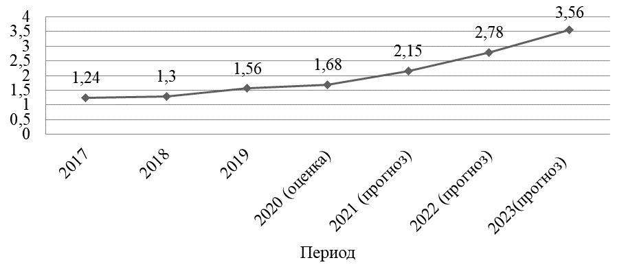 Далее на основе полученных прогнозных показателей определим изменение коэффициента бюджетной составляющей финансовой безопасности Брянской области (рис.5).