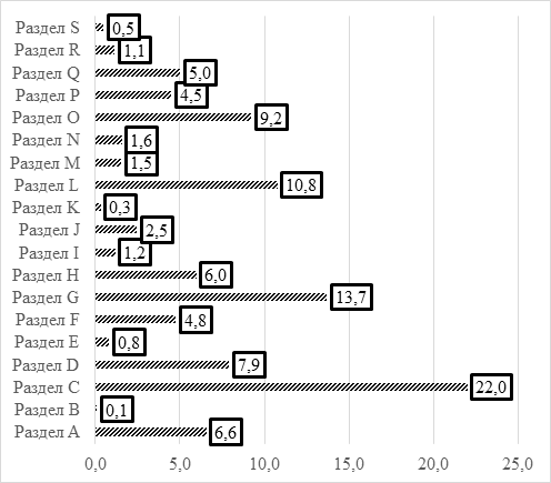 В настоящее время территория Костромской области является одним из самых больших по площади регионов Центрального федерального округа – 60211 км2, с незначительной численностью населения – 628423 человека (18 место в Центральном федеральном округе). В среднем за период исследования с 2015 по 2020 года в структуре валового регионального продукта наибольшая доля приходится на обрабатывающие производства - 22,0%, оптовую и розничную торговлю, ремонт автотранспортных средств и мотоциклов – 13,7% (рисунок 1).