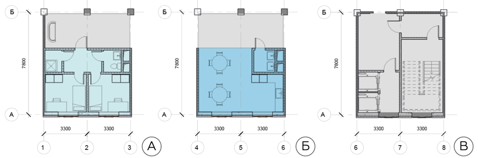 В модульной системе предусмотрены решения для всех рассмотренных функциональных зон [5, 6], однако в рамках данной статьи рассмотрены планировки жилых этажей. Далее представлены типовые блоки - жилой, блок для приготовления и приема пищи и лестнично-лифтовой узел.