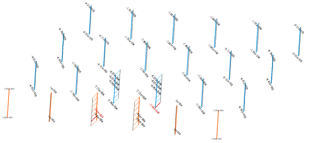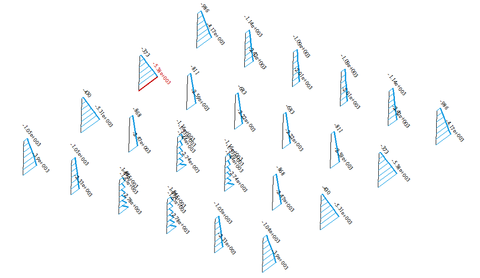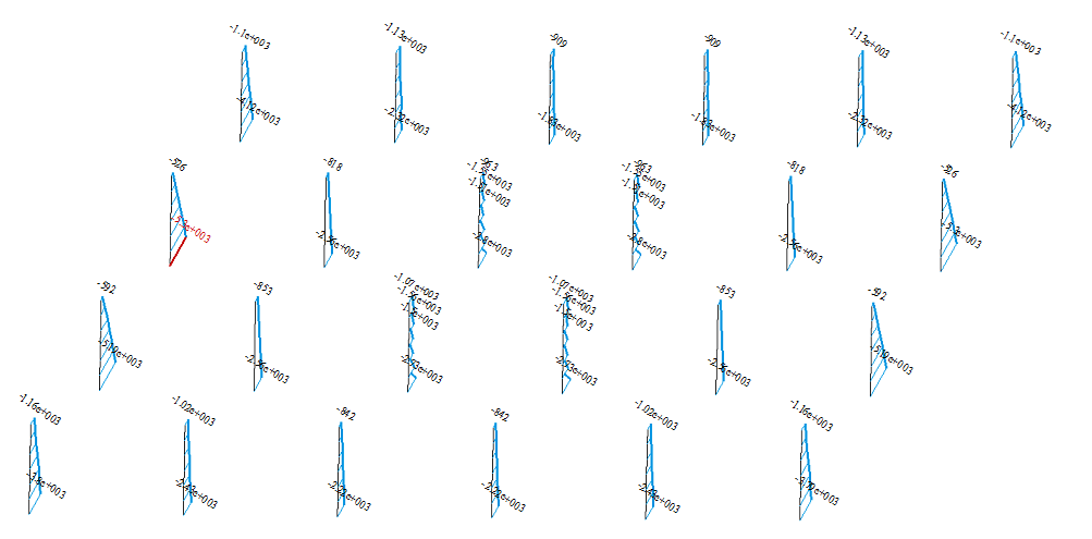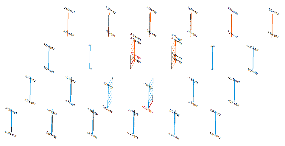 Наибольшее растягивающее усилие в схеме «а» составляет 73400 kN, сжимающее 86000 kN при этом наиболее загруженными колоннами оказались те, которые примыкают к ядру жесткости. В схеме «б» наибольшее растягивающее усилие составило 72900 kN, сжимающее 79200 kN. Разница составляет около 8%. При этом стоит отметить, что усилия в колоннах примыкающих к ядру жесткости в несколько раз выше чем в остальных колоннах, это свидетельствует о том, что ядро жесткости воспринимает большую часть нагрузки, и существенно разгружает другие конструкции.
