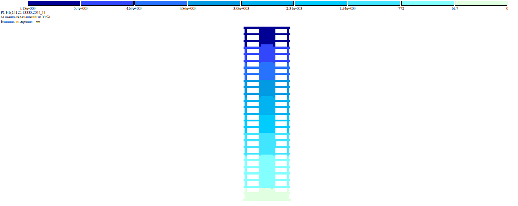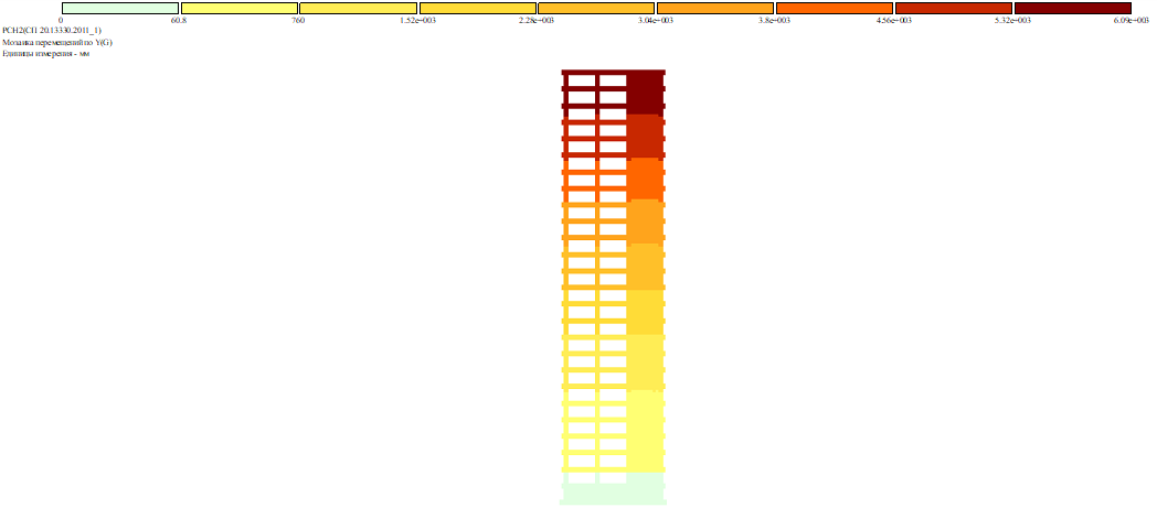 2. Большие значения перемещения вызваны тем, что для здания такой конфигурации (высота 75 метров, ширина 20 метров) недостаточно устройства ядра жесткости только в ЛЛУ, необходимо вводить дополнительные диафрагмы жесткости, однако они могли помешать оценить влияние расположения ядра жесткости и поэтому вводится не стали.