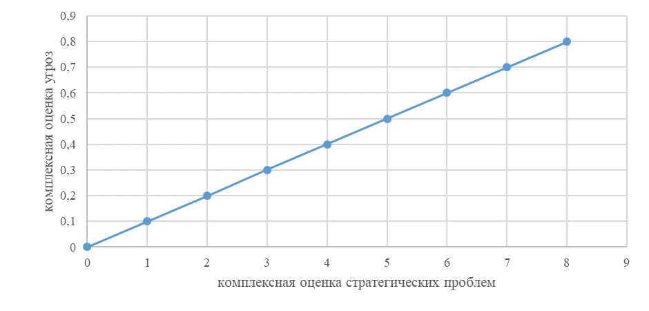 Результатом исследования в данной авторской модели зависимости стратегических проблем и комплексной оценке угроз при реализации НП «Образование» выступает минимальное значение, соответствующее удаленности выделенных индикаторов от эталонных значений. Таким образом, необходимо отдельно построить рейтинг по всей совокупности стратегических проблем в разрезе отдельных регионов (территорий) и комплексной оценке выявленных и систематизированных угроз, а в последствии общая сумма мест по каждому из претендентов для сравнительного анализа является тем результирующим значениям, которое предоставляет возможности построения общего рейтинга регионов по уровню устойчивости системы ЭБ.