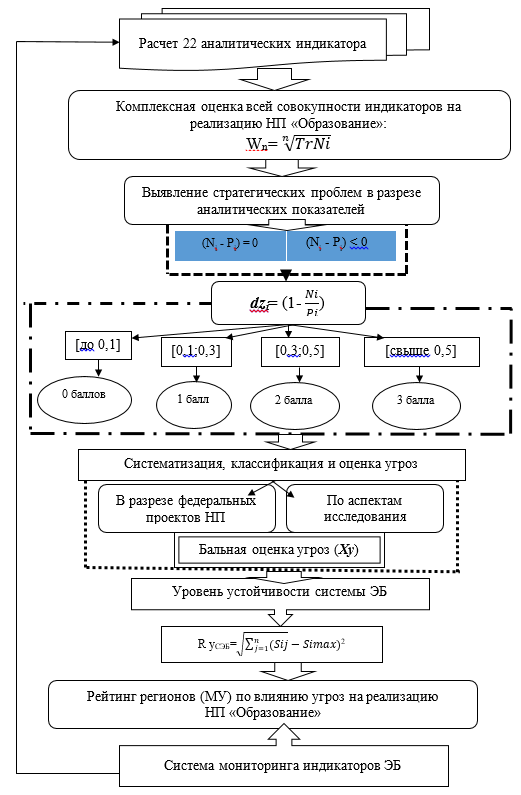 Представленная авторская система показателей структурно включает в себя 22 индикатора, которые в совокупности предоставляют возможности оценить тенденции основных направлений реализации федеральных проектов, входящих в НП «Образование» на основе сопоставления фактических значений в разрезе каждого из представленных результирующих значений (Ni) с пороговыми значениями (Pi) и в последствии позволяют осуществить качественную оценку для последующей дифференциации угроз и выработки комплекса последовательных процедур.