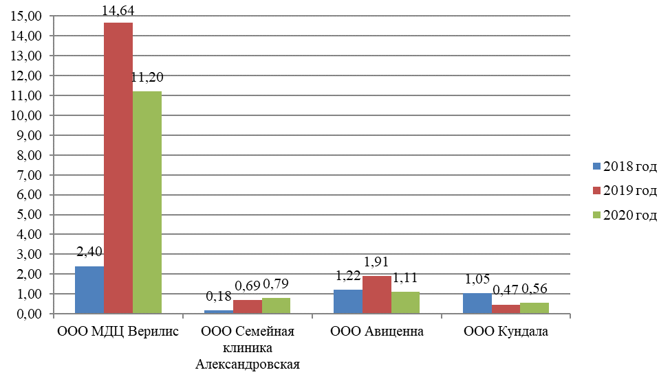 Исследование управления финансовыми рисками можно провести на примере нескольких предприятий одной сферы в разных регионах. Для анализа взяты четыре региона и соответственно 4 предприятия (сфера медицина): ООО «МЦ Кундала» (г. Москва); ООО «Семейная Клиника Алексанровская» (Челябинская область); ООО «Авиценна» (Ростовская область); ООО «ДМЦ Верилис» (г. Санкт-Петербург) [16]. Все они соответствуют критериям, относящим их к малому бизнесу, и занесены в реестр субъектов малого предпринимательства.