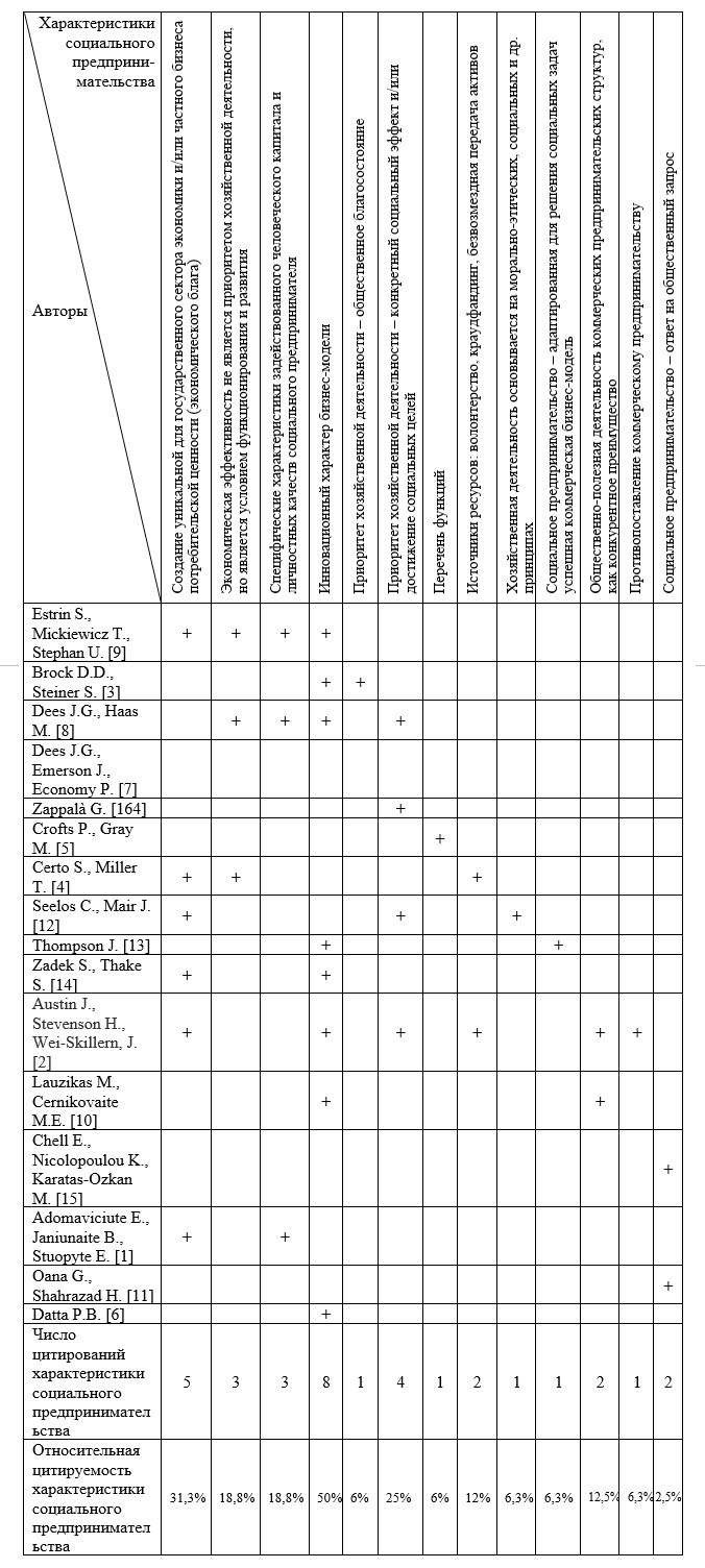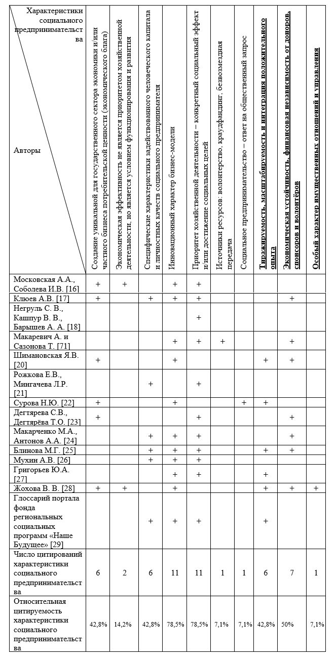 Анализа трактовок (Таблица 1) позволил выделить наиболее существенные характеристики, используемые иностранными авторами для определения экономической сущности социального предпринимательства. Наиболее часто цитируемой характеристикой является инновационный характер бизнес-модели. Предполагается, что социальное предпринимательство – всегда нетривиальный и оригинальный подход к организации хозяйственной деятельности, который ранее не использовался ни в практике государственного сектора экономики ни в коммерческой сфере.