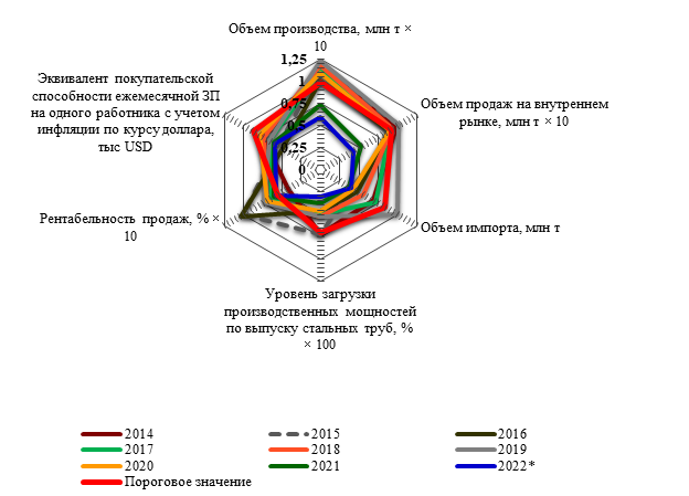 Рисунок 5. Радар экономической безопасности трубопрокатной отрасли РФ за 2014-2022 годы (номинальные значения основных показателей). Источник: составлено автором по данным Росстат, Ru-Stat, ФТС РФ, Trade Map, Commodity Trade Statistics Database (UN Comtrade)