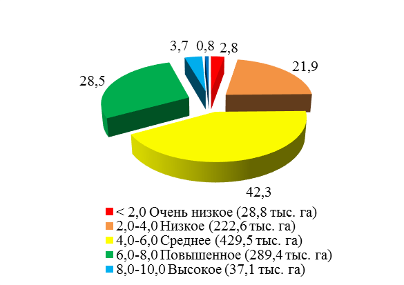Рисунок 1. Тюменская область. Структура площади пашни Тюменской области по содержанию гумуса в % на 01.01.2020 год