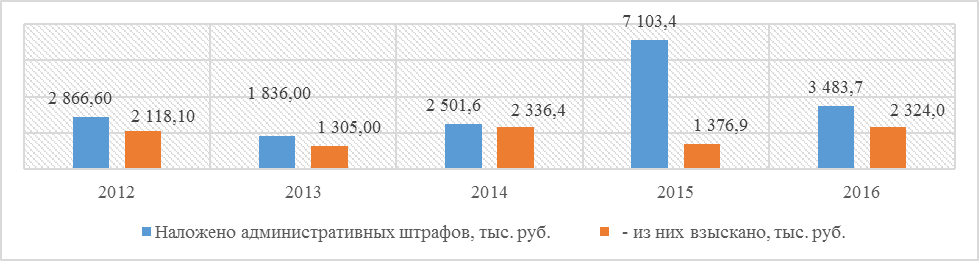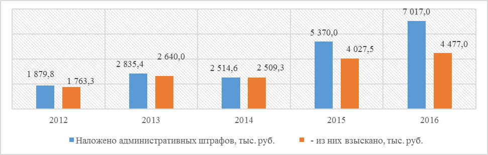 4) за анализируемый период с 2012 по 2016 гг. наблюдается рост суммарной величины наложенных штрафов (рисунок 3).