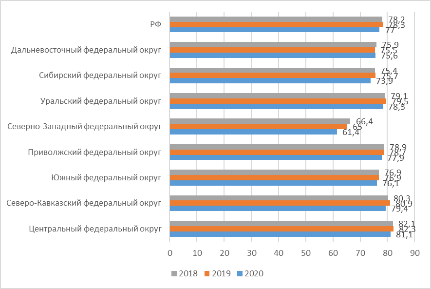 Согласно анализируемым данном, можно увидеть, что в целом по регионам России уровень занятости в трудоспособном возрасте колеблется в пределах 73-81%. Исключение составляет Северо-Западный федеральный округ, в котором уровень безработицы составляет 61%. Из-за сложной социально-экономической ситуации в 2020 году, уровень безработицы по всем регионам России вырос. В частности, по сравнению с 2018 годом, в 2020 году в Дальневосточном федеральном округе уровень занятости упал на 0,3%, в Сибирском упал на 1,5%, в Уральском упал на 0,6%, в Северо-Западном упал на 5%, в Приволжском упал на 1%, в Южном упал на 0,8%, в Северо-Кавказском упал на 0,9%, в Центральном упал на 1%. Всего по России уровень занятости, по сравнению с 2018 годом, в 2020 году упал на 1,2% [5].
