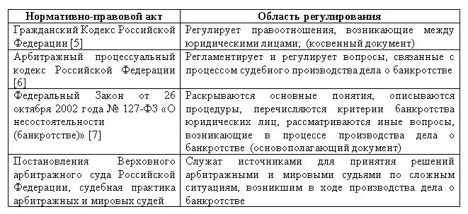 Таблица 1 - Нормативно-правовые акты в области банкротства юридических лиц в Российской Федерации