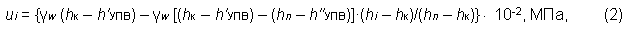 Значение полного вертикального напряжения σi рассчитывают методом послойного суммирования, а поровое давление ui определяют с учетом уровня подземных вод в рассматриваемом слое грунта. Таким образом учитывается разница пьезометрических напоров в разных слоях, разделяемых слабо фильтрующими слоями грунтов (СФГ).