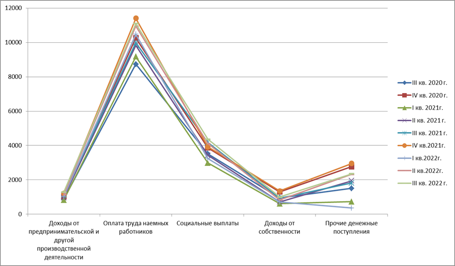 По данным таблицы 2. наблюдаем увеличение денежных доходов в 2022 году по сравнению с 2021 годом за три квартала и имеют тенденцию к росту по всем видам поступлений, кроме прочих денежных поступлений, по которым наблюдается снижение за 1 квартал 2022 года на 367 млрд. рублей по сравнению с 1 кварталом 2021 года. В анализируемых периодах наибольший удельный вес в структуре денежных доходов занимает оплата труда наемных работников, составившая 57,3% в 2021 году и 55,32% в третьем квартале 2022 года. Наименьший удельный вес занимают доходы от предпринимательской и другой производственной деятельности (5,5% в 2021 году и 6,4% в третьем квартале 2022 года), а также доходы от собственности (5,7% в 2021 году и 5,0% в третьем квартале 2022 года).