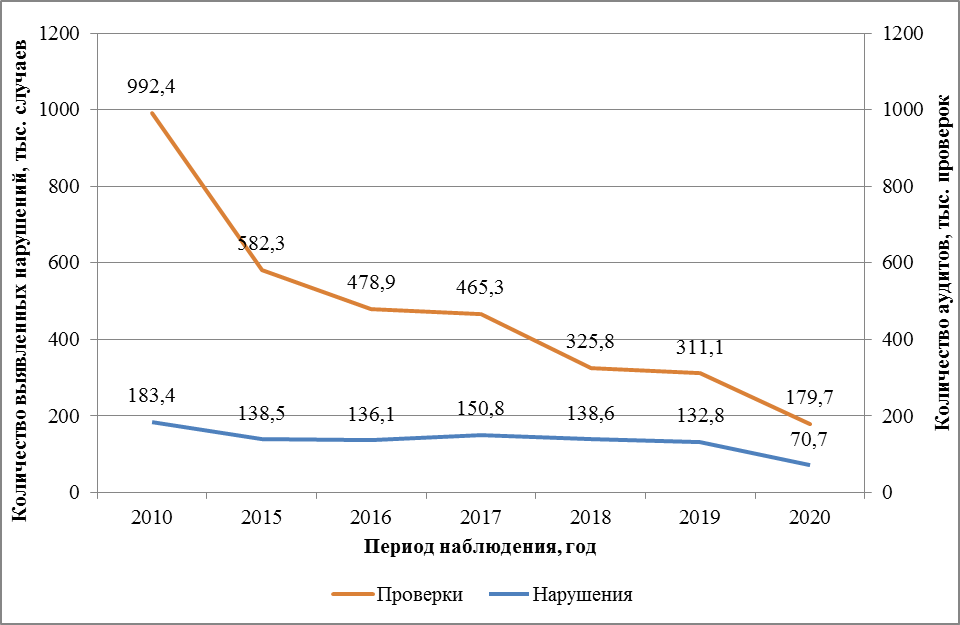 С 2010 года наблюдается снижение выявленных нарушений охраны труда, что можно связать с сокращением трудовых ресурсов страны, а также более ответственным подходом работодателей к процедуре обучения и инструктирования работников правилам по охране труда. Однако в 2020 году увеличилось количество нарушений по оплате и нормированию труда, что связано с введенными строгими санитарно-эпидемиологическими ограничениями во время пандемии COVID-19, которые привели к большому количеству сокращений и переходу части сотрудников на удаленный режим работы [11-17].