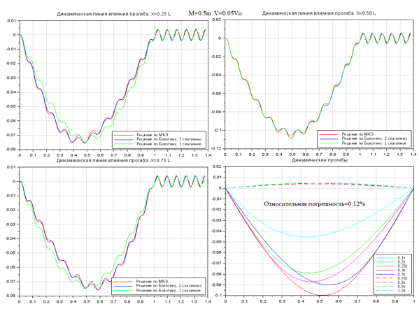В расчетах варьировались отношение массы груза к массе балки в сегменте [0.05…0.5] и отношение скорости груза к «критической» в таком же сегменте.