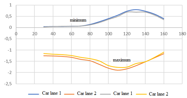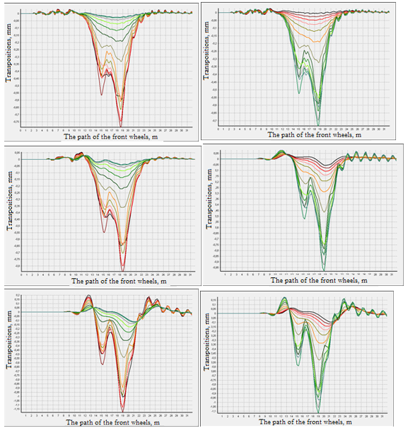 В результатах очевидно влияние скорости движения на динамическую реакцию конструкции. Хотя для каждого типа автомобилей неизменна нагрузка, передаваемая со стороны колес на поверхность дороги, также неизменны расстояния между колесными осями и расположением колес на оси, очевидно отличие в графиках колебаний при движении с разной скоростью. Статическая постановка не позволяет учесть этот эффект. При увеличении скорости нарастают максимальные перемещения, а также увеличивается «выпор» — подъем в процессе колебаний отдельных точек дорожной конструкции. Затем, при увеличении скорости, перемещения начинают снижаться. Также величины перемещений зависят от полосы движения. При движении автомобиля по дальней от края откоса полосе перемещения снижаются – рис. 12.