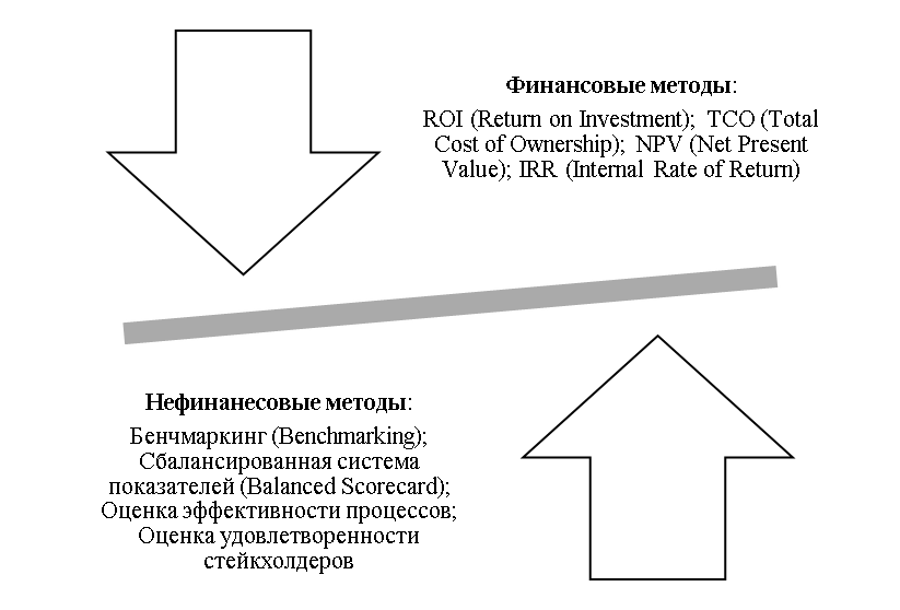 Среди методов оценки эффективности IT-проектов сегодня применяются различные подходы, основанные на анализе показателей эффективности, принятых в качестве критериев экономической целесообразности и результативности (рис. 1).