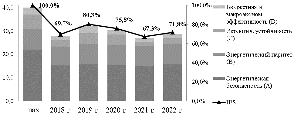 Итоговое значение индекса энергетической безопасности IES в топливной отрасли, а также компоненты, входящие в его состав (А-D): энергетическая безопасность, энергетический паритет, экологическая устойчивость энергетической системы, бюджетная и макроэкономическая эффективность энергетических систем отражены на рисунке 1.