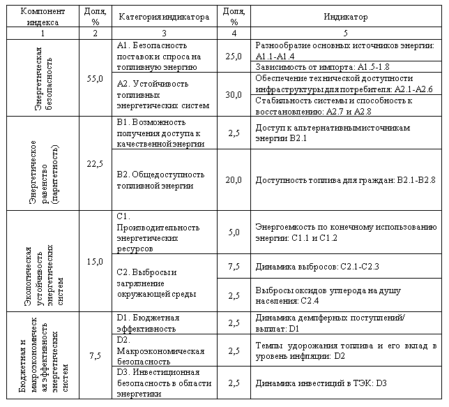 Объединив индекс World Energy Trilemma Index c результатами исследований и методическими рекомендациями, предложенными вышеуказанными авторами была получена усовершенствованная структура индекса IES (таблица 1), позволяющая дать оценку уровня энергетической безопасности для топливной отрасли.