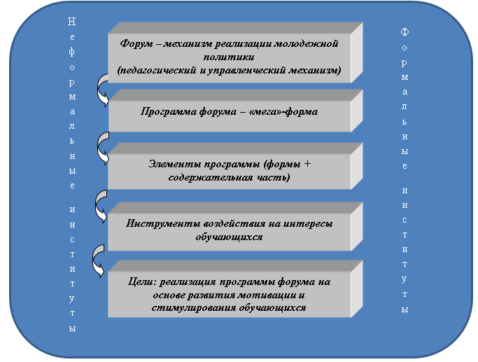 Но в научных исследованиях и обсуждениях не так часто ставится вопрос об эффективной структуре и формах организации форумной студенческой деятельности, в силу ее специфичности, относительной редкости и уникальности и принадлежности по большей части к воспитательной, «внеучебной» деятельности. Но благодаря осознанию на уровне Правительства РФ (прежде всего, Министерства науки и образования) важности погружения студентов в проектную деятельность и выделению ресурсов, в том числе цифровых, Федерального агентства по делам молодежи (Росмолодежи) университеты получили возможность реализовывать форумные проекты разных масштабов, причем молодежный форум рассматривается, как самостоятельный механизм реализации социально-экономических целей молодежной политики в РФ [7]. Данный механизм  реализуется в особой институциональной среде: формальных норм сферы образования, молодежной политики и норм, обеспечивающих хозяйственную деятельность, а также неформальных норм, носителем которых являются организаторы форума (это нормы накопленного опыта: педагогического и управленческого, а также реализации различных профессиональных и надпрофессиональных компетенций, в том числе связанных с маркетинговыми и цифровыми технологиями, социального капитала, обеспечивающего взаимодействие между различными участниками проекта) (рис. 1).