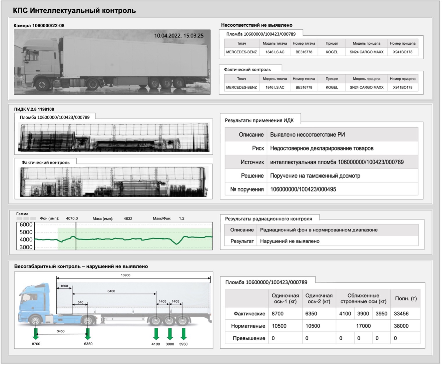 Пример логичного проектирования интерфейса ПО комплексного потокового ТСТК для ИПП представлен на рис. 3. Результат сравнения РИ, представленной в электронной пломбе (без признаков модификации) с результатом фактического применения модуля ИДК расположены вертикально для упрощения выявления несоотвтествий. Ниже последовательно расположены результаты радиационного и весогабаритного контроля, что позволяет визуально соотнести уровень распределения ионизирующего излучения, степень распределения нагрузки на оси ТСМП и расположения товаров в прицепе.