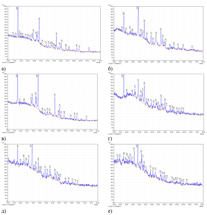 При пропаривании данного состава (рис.1в), рефлексы портландита Ca(OH)2 с d = (2,63; 1,93) Å выражены более четко, а рефлекс d = 4,93 Å практически не изменился в сравнении с 28 сутками нормального твердения, интенсивность и четкость рефлексов гидросиликатов кальция слабая.