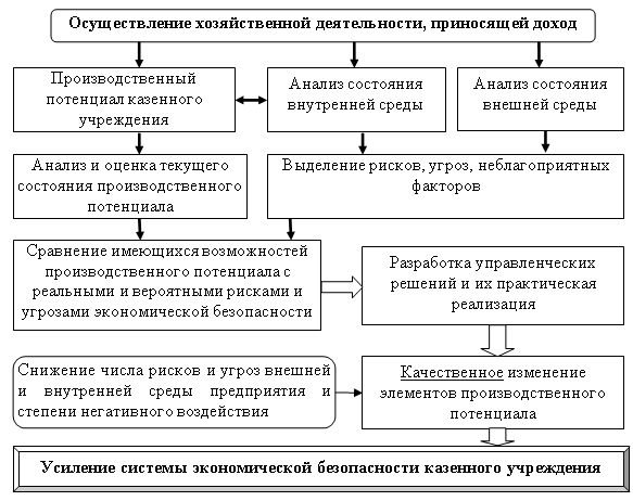 Процесс принятия грамотных управленческих решений административным аппаратом в соответствии со стратегией организации и целями нормативно-правовых актов, своевременное выявление скрытых резервов, умелое их использование повысят конкурентоспособность производства в целом и будут способствовать более эффективному управлению производственного потенциала. Адекватная оценка имеющихся производственных ресурсов в сравнении существующей конъюнктурой и запросами рынка, формирование системы и механизмов управления рисками и угрозами внутренней и внешней среды казенного учреждения, на основе постоянного взаимодействия с вышестоящими органами государственной власти, смогут снизить вероятность возникновения управляемых дестабилизирующих факторов внутренней среды, что положительно скажется на системе экономической безопасности казенного учреждения.
